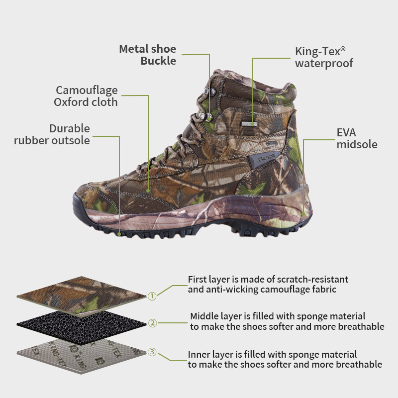 ①最初の層は傷がつきにくく、吸湿発散性に優れた迷彩生地で作られています。②中間層にはスポンジ素材が充填されており、靴がより柔らかく通気性が高くなります。③内層にはスポンジ素材が詰められており、靴がより柔らかく通気性が高くなります。