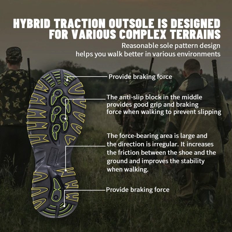 ①Poliyou の高伸縮性吸湿発散性インソールが内部をドライに保ちます。②迷彩布で包まれたEVAミッドソール、クッション性と衝撃吸収性。③耐久性のあるゴム製アウトソール、滑り止め、耐摩耗性。