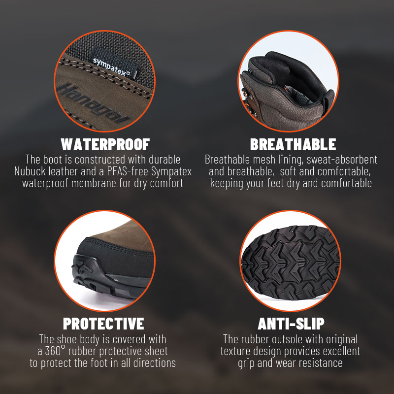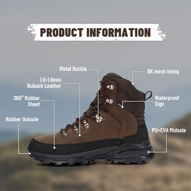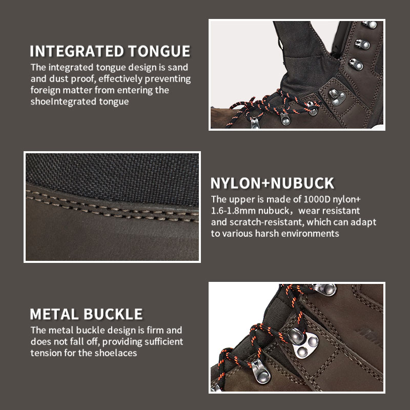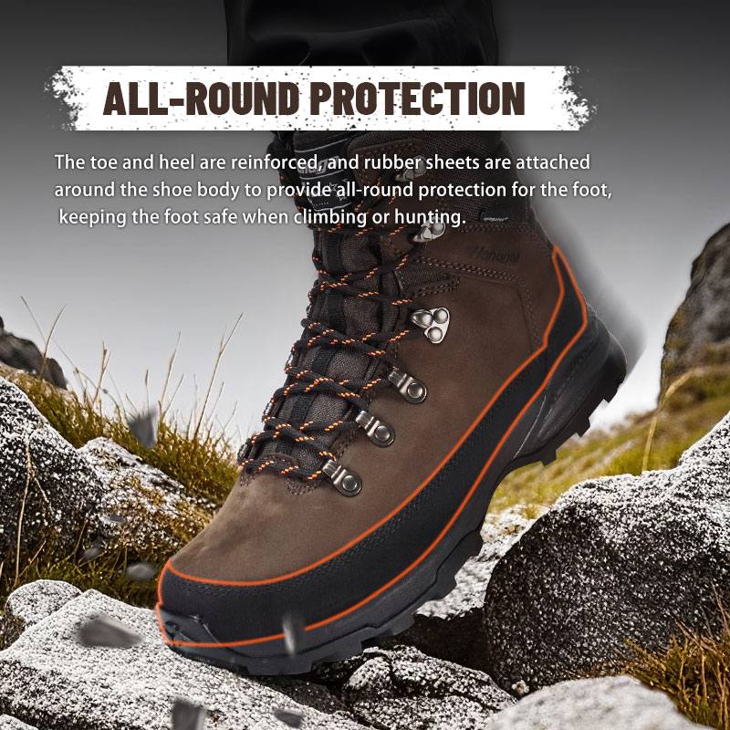 つま先とかかとは補強され、靴本体の周囲にはゴムシートが取り付けられており、足を全面的に保護し、登山や狩猟時に足を安全に保ちます。